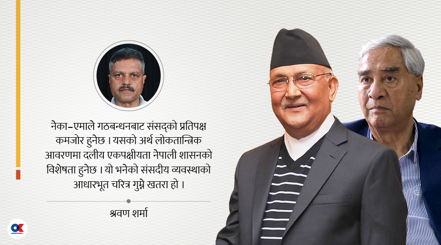 प्रतिपक्षीविहीन लोकतन्त्रः नेका एमाले सत्ता गठबन्धनले संसद्को प्रतिपक्ष कमजोर हुने निश्चित छ । नेकपा (माओवादी) रचनात्मक प्रतिपक्षको भूमिकामा अभ्यस्त छैन । रास्वपा, अन्य साना दलहरूमा देखिएको सत्तामोहले प्रतिपक्षीय रणनीति बन्न सक्दैन । कमजोर प्रतिपक्षका कारण संसद् र सरकार दुवैतिर सत्ताधारी दलहरूको एकलौटी उपस्थिति रहनेछ ।